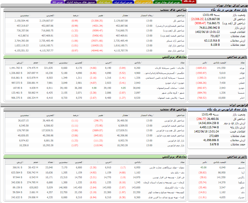 در فرابورس نیز نمادهای آریا، زاگرس و شگویا بیشترین اثر کاهشی را بر شاخص داشتند و نمادهای وسپهر، پارتا و ددانا بیشترین اثر کاهنده را بر شاخص کل  فرابورس  داشتند.