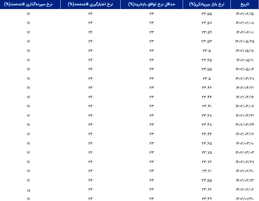 بر اساس آمار منتشر شده از سوی بانک مرکزی، نرخ بهره بین بانکی در هفته منتهی به چهارشنبه ۱۵ شهریور به ۲۳.۵۵ درصد رسید.
