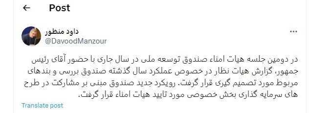موافقت هیات امناء صندق توسعه ملی با مشارکت در طرحهای بخش خصوصی