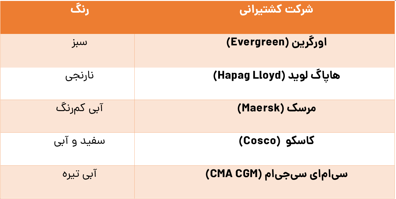 3.شناسایی و هویت برند: شرکتهای کشتیرانی بزرگ معمولاً برای شناسایی راحتتر کانتینرهای خود از رنگهای منحصر به فرد استفاده میکنند. این امر نه تنها موجب تسهیل در شناسایی کانتینرها میشود بلکه به تقویت هویت برند شرکت کمک میکند. برخی از بزرگترین شرکتهای کشتیرانی و رنگهای مورد استفاده آنها به شرح زیر است: