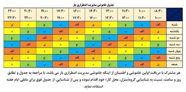 خاموشیها به صورت دورهای و در هر بار به مدت یک ساعت و نیم اجرا میشود. در اینجا، جدول خاموشیهای برنامهریزیشده برای این ماه آورده شده است.