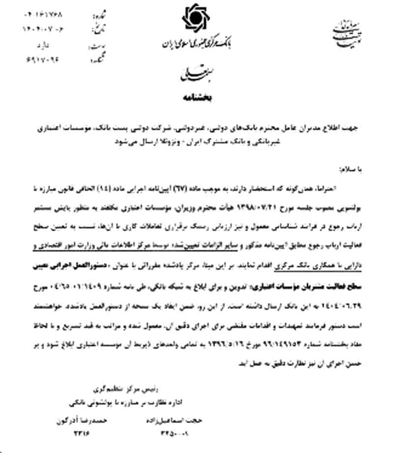 بانک مرکزی تأکید کرده است که متن کامل دستورالعمل باید بیدرنگ به تمام واحدهای ذیربط ابلاغ و بر حسن اجرای آن نظارت سختگیرانه شود.