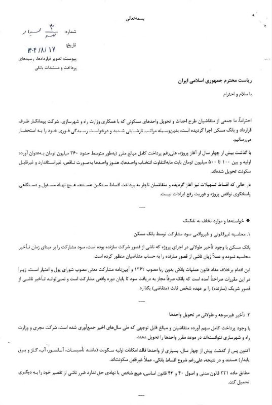 اعتراض متقاضیان مسکن ملی در مقابل نهاد ریاست‌جمهوری به دریافت سود ظالمانه مشارکت/ چرا باید مردم ۲۵۰ میلیون تومان جریمه تأخیر سازنده را بپردازند؟ + سند