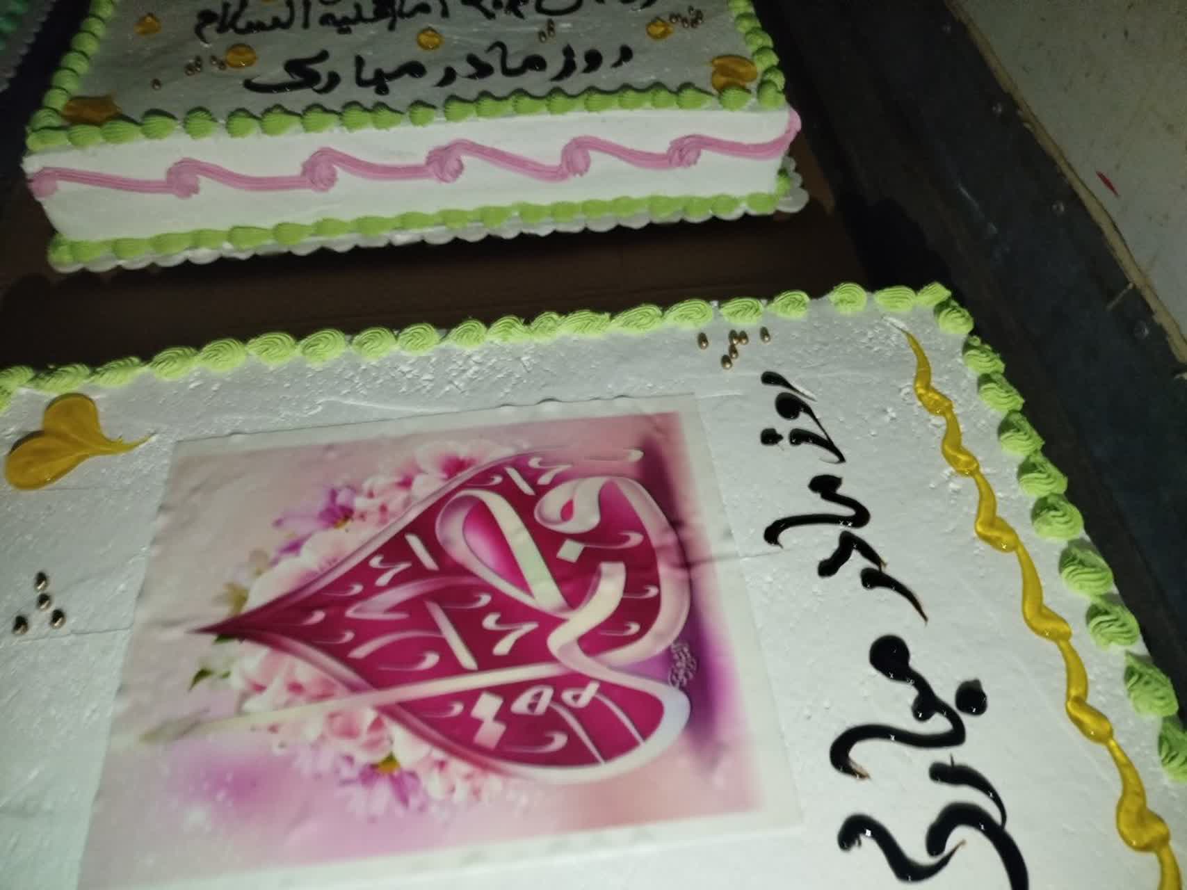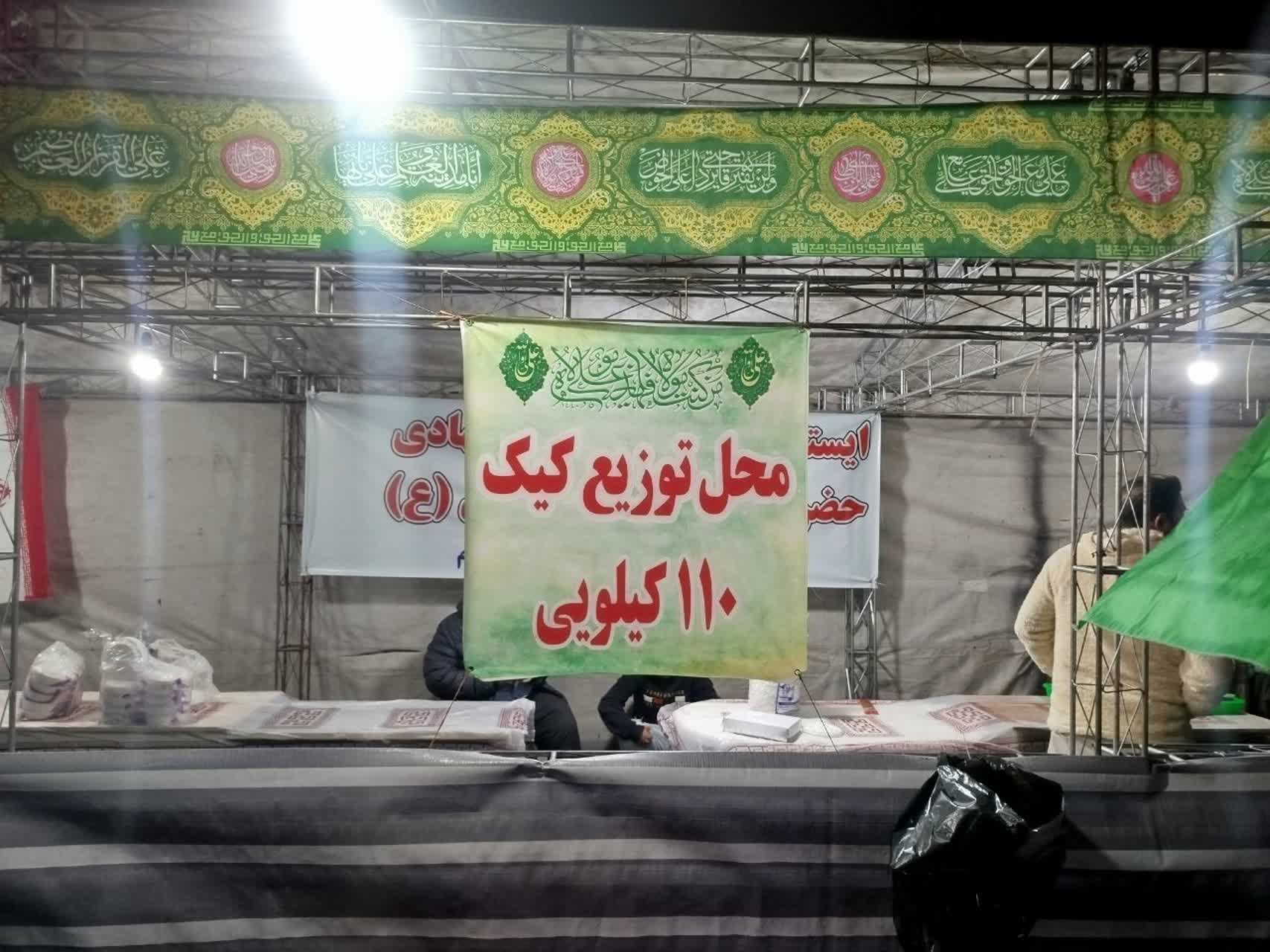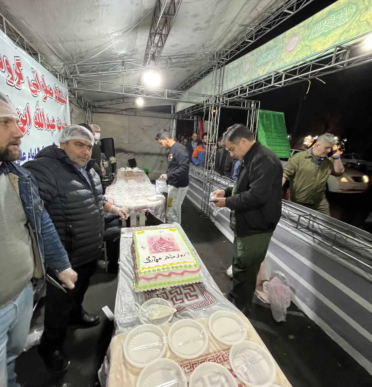 موکب جهادی حضرت عبدالله ابن الحسن علیه السلام در شب میلاد مادر با کیک 110 کیلویی به پذیرایی مردم رفت