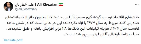 خضریان در این پست نوشت که بر اساس اطلاعات موجود، بانکهای اقتصاد نوین و گردشگری همچنان بخش قابل توجهی از ضمانتهای صادراتی کاتد را بلوکه نگه داشتهاند و این موضوع میتواند بر جریان صادرات و بازگشت ارز تأثیر منفی بگذارد. وی این عملکرد را در تضاد با افزایش هزینههای تبلیغاتی این بانکها دانست و افزود که شنیدهها نشان میدهد بخش عمده این بودجه تبلیغاتی صرف حمایت از برنامه فوتبالی عادل فردوسیپور، مجری شناختهشده ورزشی، شده است.
