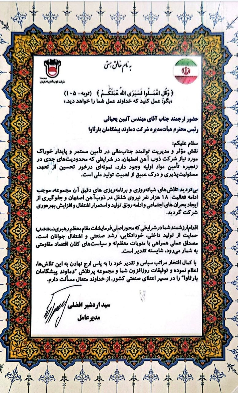 در همین راستا، ذوبآهن اصفهان به همراه جامعه اسلامی کارگران، با صدور تقدیرنامهای رسمی، از تلاشها و مدیریت مسئولانه مهندس آتبین یحیایی ـ رئیس هیأتمدیره شرکت «دماوند پیشگامان بارثاوا» و از چهرههای جوان و فعال حوزه معدن و پیمانکاری ـ قدردانی کرد. این تقدیرنامه که به امضای سید اردشیر افضلی، مدیرعامل ذوبآهن اصفهان، و کرمی، دبیرکل جامعه اسلامی کارگران رسیده است، بر نقش محوری این مجموعه در عبور از یکی از مقاطع حساس تولید تأکید دارد.