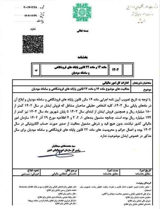 به گزارش شبکه اطلاع رسانی راه دانا؛ سید محمد هادی سبحانیان، معاون وزیر اقتصاد و رئیس کل سازمان امور مالیاتی در بخشنامهای به ادارات کل امور مالیاتی، اشخاص حقیقی و مشاغل معاف از الزام به صدور صورتحساب الکترونیکی ذیل قانون سامانه مؤدیان و پایانههای فروشگاهی را ابلاغ کرد.