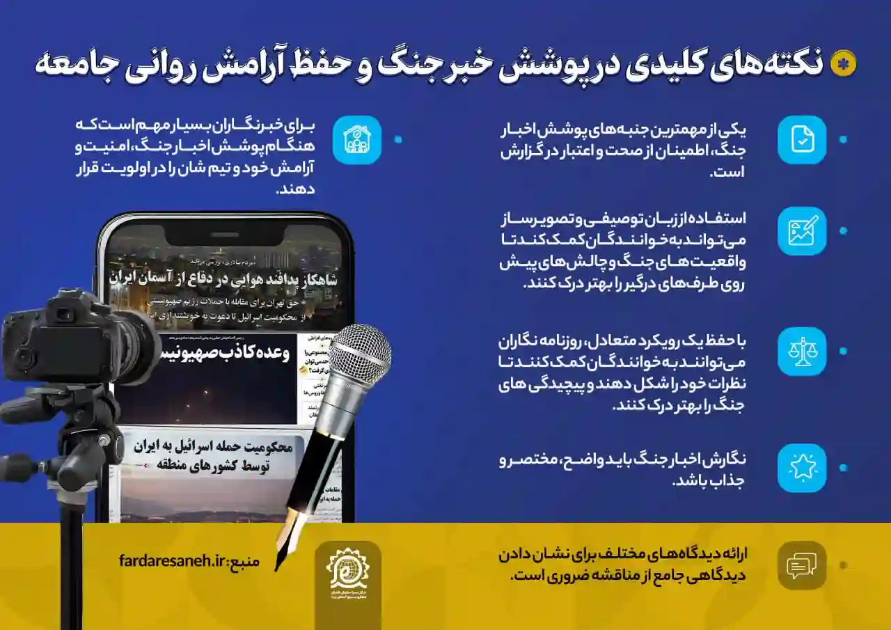 خبرنگاران برای پوشش خبر جنگ و حفظ آرامش روانی جامعه لازم است سواد رسانه ای داشتنه باشند و موارد لازم را مورد توجه قرار دهند.