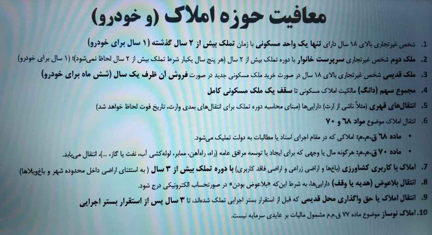 - فروش دومین ملک سرپرست خانوار، در صورتی که بیش از دو سال از خرید آن بگذرد (هر پنج سال یکبار).
