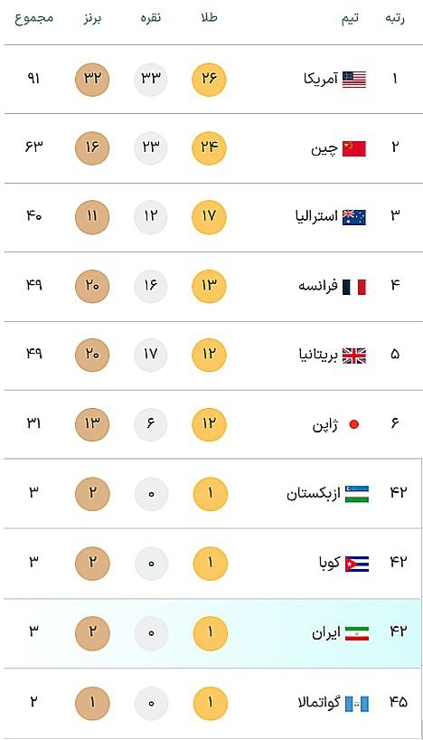 بازیهای المپیک پاریس| ایران در رده 42، آمریکا در صدر+جدول