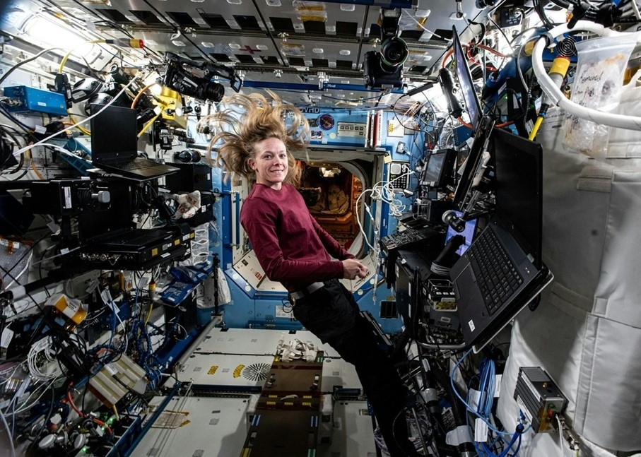 فضانورد زن در ایستگاه فضایی با موی معلق در بی‌وزنی