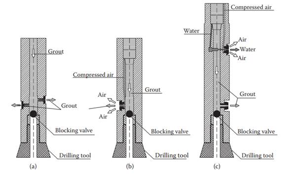 شکل 2 : شکل شماتیک روش‌های اجرای تزریق پرفشار: (الف) تک سیاله، (ب) دو سیاله و (ج) سه سیاله