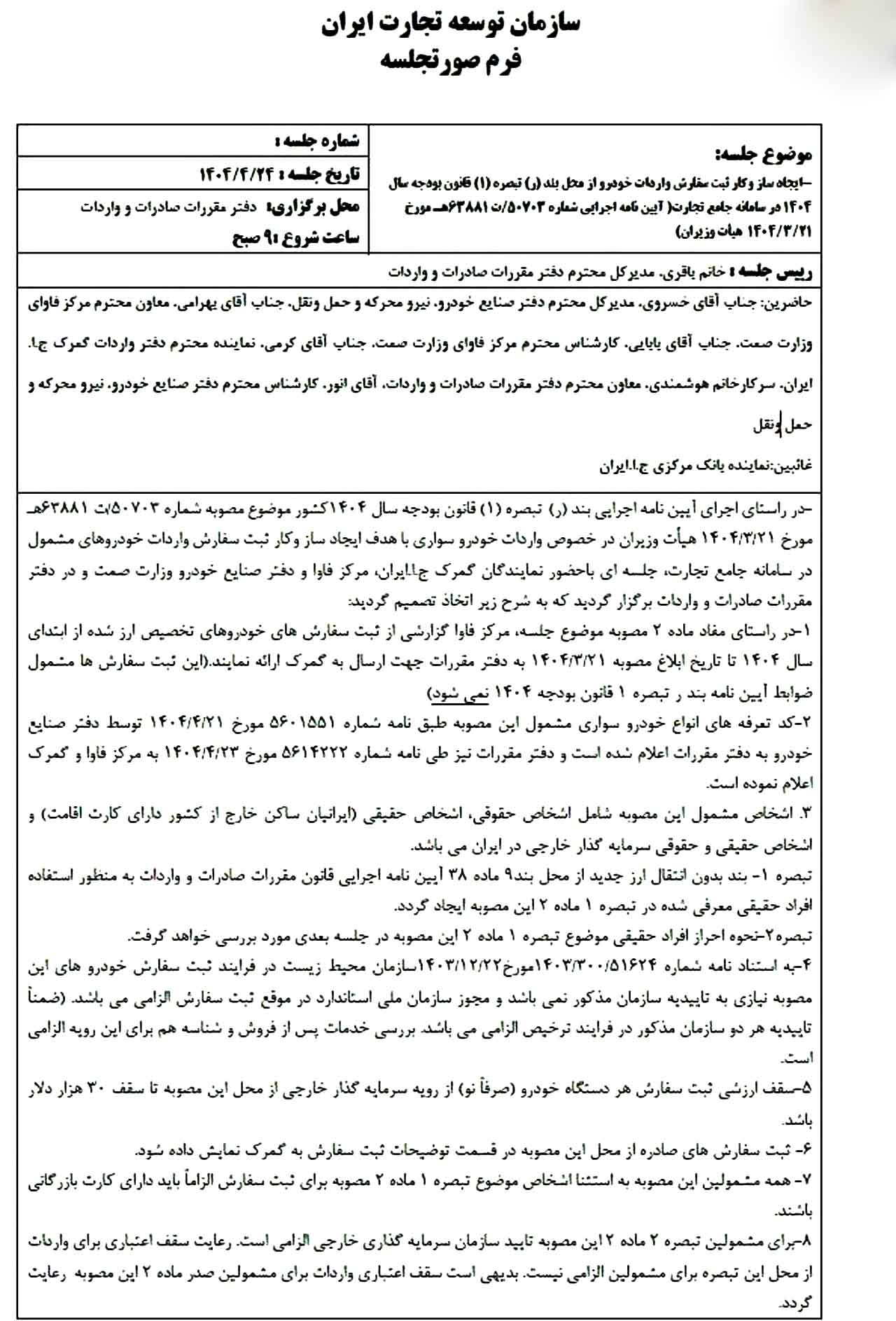 دفتر واردات گمرک جمهوری اسلامی ایران مقررات جدیدی را برای واردات خودرو ابلاغ کرد. این مصوبه، که بر اساس صورتجلسه ۱۶ بندی تهیهشده توسط سازمان توسعه تجارت ایران صادر شده، تحولات گستردهای در فرآیند ثبت سفارش، ترخیص و منشأ ارز وارداتی خودرو ایجاد میکند.