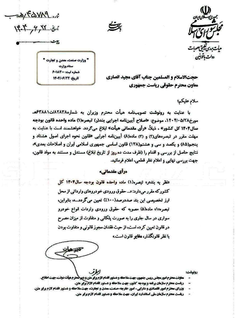 موضوع؟ مصوبه‌ای که هیئت وزیران درباره تعرفه واردات خودرو تصویب کرده، و با قانون بودجه سال ۱۴۰۴ تضاد دارد.