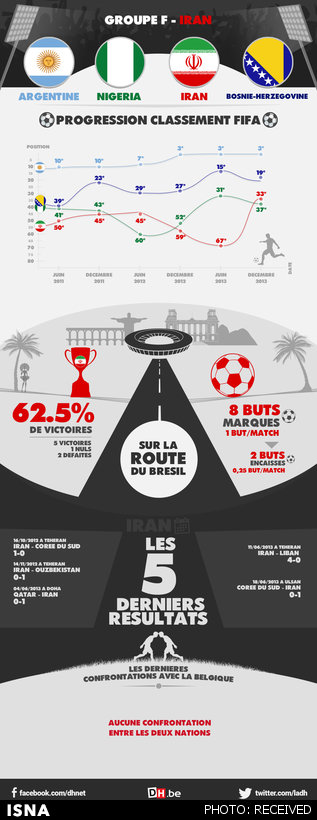 به گزارش شبکه اطلاع رسانی داناتیم ملی ایران با صعود به جام جهانی 2014 برزیل تابستان آینده در گروه F با تیمهای آرژانتین، نیجریه و بوسنی و هرزگوین همگروه است و در اولین دیدار خود باید در شهر کوریتیبا بازی کند.
